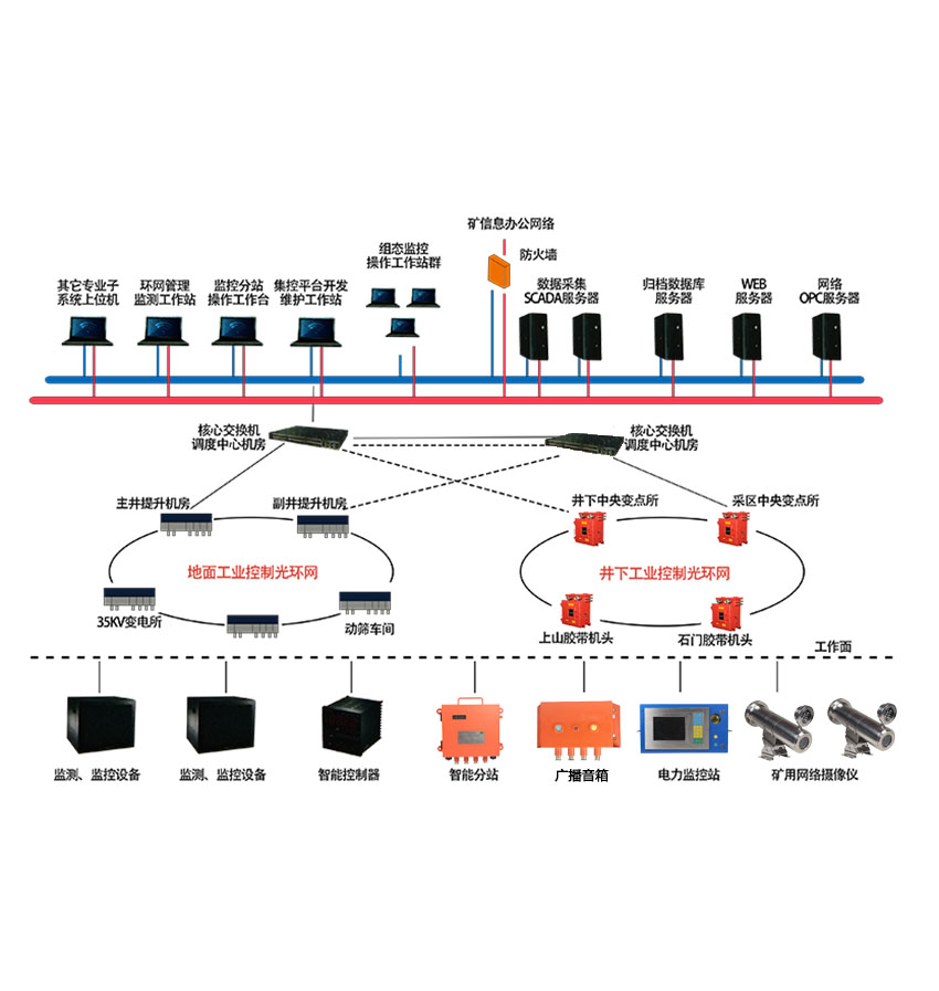 建設(shè)煤礦萬兆工業(yè)以太環(huán)網(wǎng)系統(tǒng),實現(xiàn)井下生產(chǎn)與井上辦公協(xié)同發(fā)展,生產(chǎn)子系統(tǒng)實現(xiàn)平臺化操作,統(tǒng)一管理、統(tǒng)一認(rèn)證、統(tǒng)一風(fēng)格、統(tǒng)一標(biāo)準(zhǔn),實現(xiàn)系統(tǒng)操作、界面數(shù)據(jù)的大融合;工作人員能通過智能化綜合管控平臺查看所有原有系統(tǒng)的生產(chǎn)、報警等信息,實現(xiàn)調(diào)度報表自動化、安全生產(chǎn)過程管控自動化。