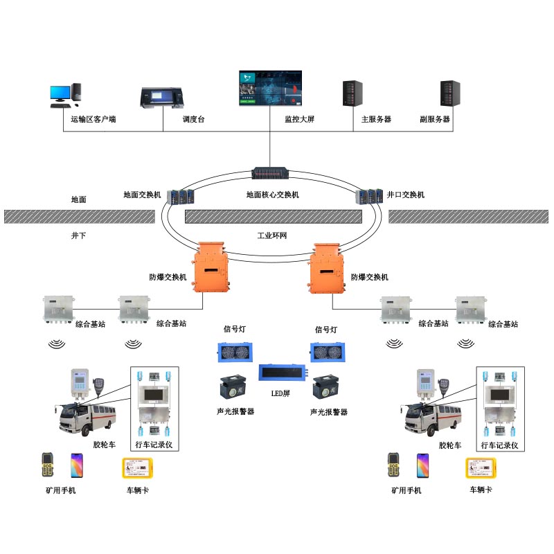 ◆為了更好地實現(xiàn)對膠輪車進行調(diào)度,可增加WIFI、4G、5G無線語音通信系統(tǒng)與無軌膠輪車運輸監(jiān)控系統(tǒng)配合使用,可以實現(xiàn)語音通信系統(tǒng)與運輸監(jiān)控系統(tǒng)通信干線網(wǎng)絡共用,有效節(jié)約了礦方投資成本。